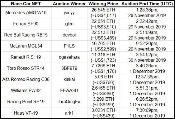 赛车区块链游戏《F1® Delta Time》F1 ®官方NFT赛车拍卖会于12月1日落下帷幕,10辆赛车同时以荷兰式拍卖的形式售出,起拍价30ETH。