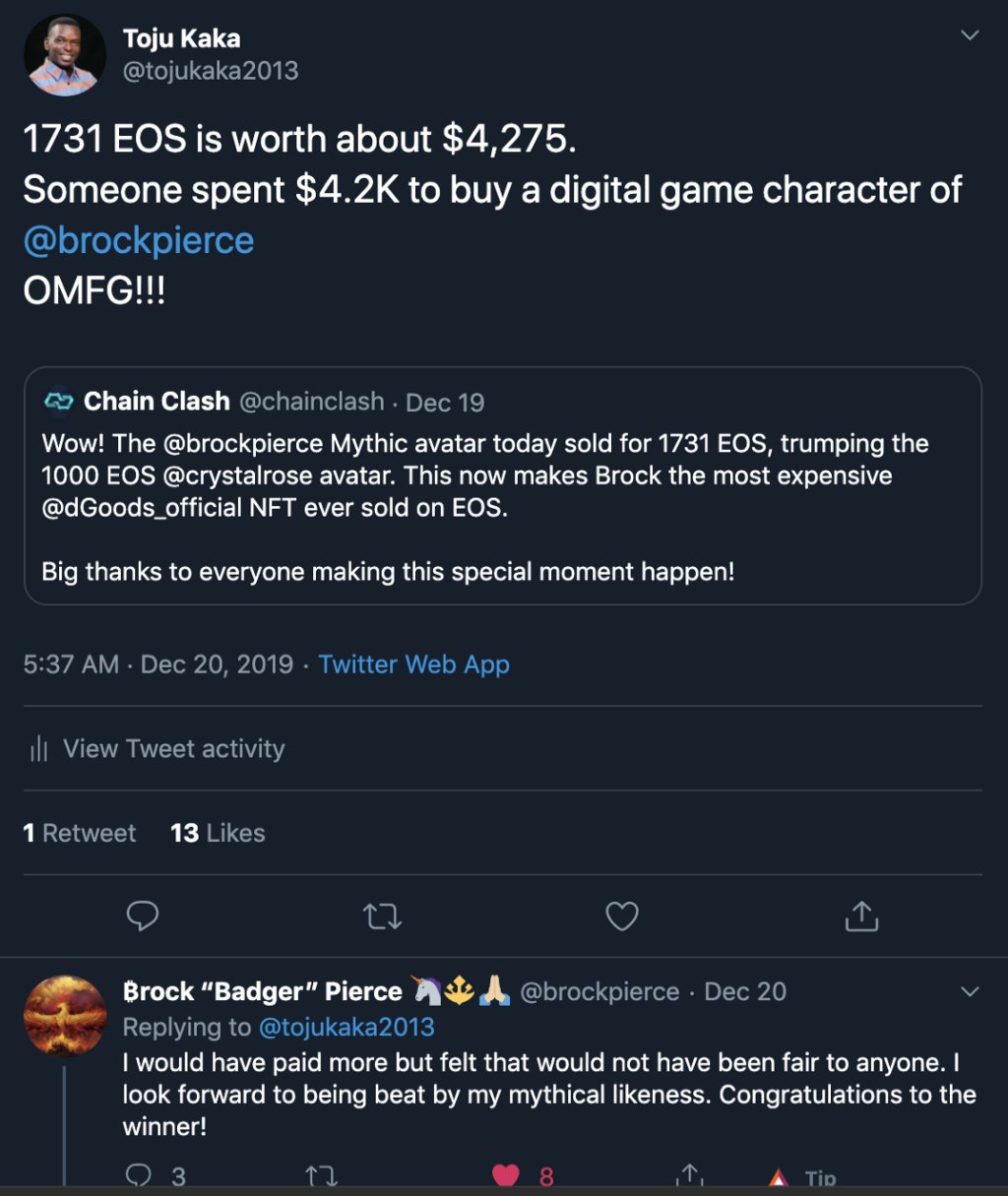 免费对战区块链游戏《Chain Clash》以1731 EOS(约4275美元)售出加密角色Brock Pierce。Brock Pierce本人很快表示了对游戏的支持,在推特上祝贺中标玩家。