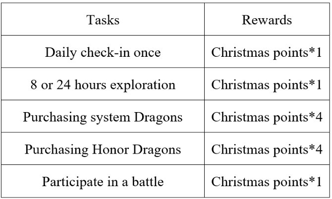 - 活动期间,驯龙师可通过完成以下任务来赚取每日“圣诞积分”: