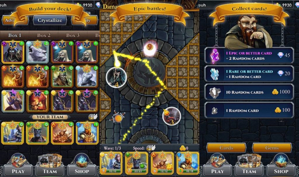 玩家可以在每轮游戏前选择若干张卡牌,每张卡牌都有特定能力。从左到右,每张卡牌都会轮到出牌机会。每轮施放卡牌不同,使用的能力也不同。例如,火球能伤害多个目标,盾牌可以抵御伤害。部分卡牌可以完美抵消敌方卡组的能力。收集不同卡牌,好处多多。