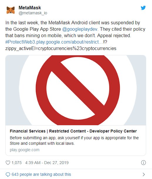 “上周,MetaMask Android客户端被Google Play应用商店@googleplaydev下架。Google引用了“禁止在移动设备上挖矿”这一政策,但我们没有。MetaMask上诉被驳回。