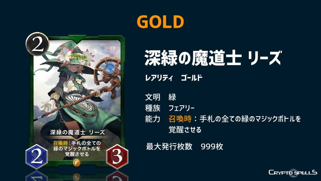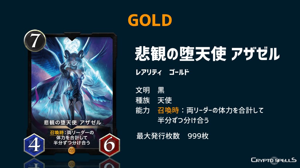 TCG区块链游戏《CryptoSpells》新一年的卡牌贩售#011开始了!这次贩售的卡牌中有GOLD等级的深绿的魔导士 利兹和悲观的堕天使 阿扎泽尔!