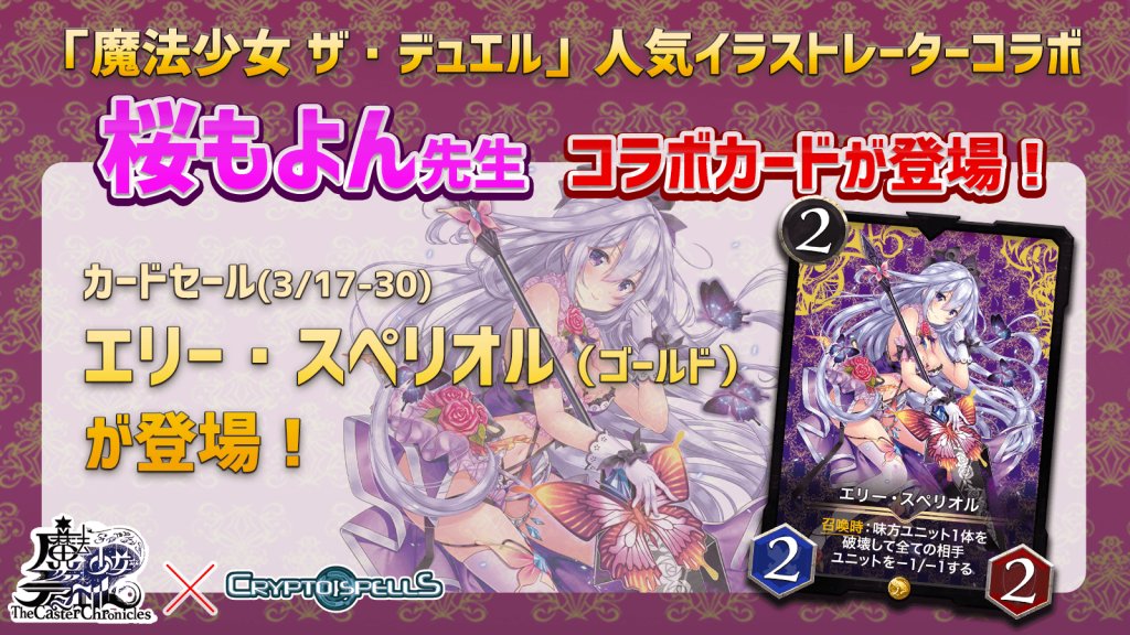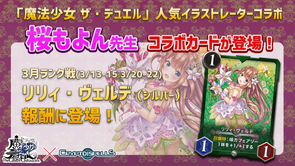 区块链卡牌游戏《CryptoSpells》与萌系美少女卡牌游戏《魔法少女THE·DUEL》中的人气画师『桜もよん』联动,三张卡牌作为3月排位赛奖励出现,另外三张在卡牌贩售#016登场,共计6种卡牌。