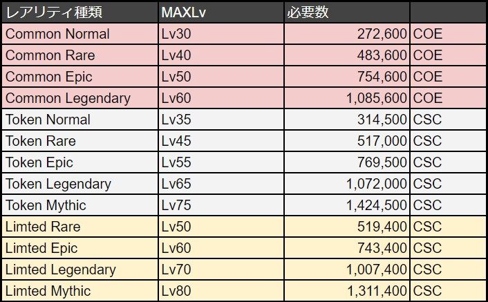 突破上限等级需要如下的CSC和COE数量。