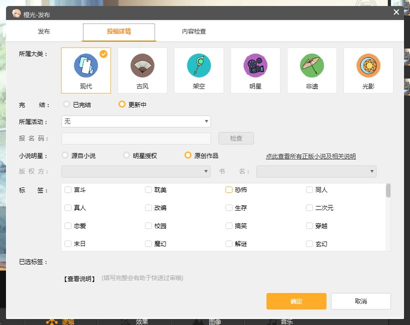 第五步,根据标签规范选择符合作品的标签,点击“确定”。