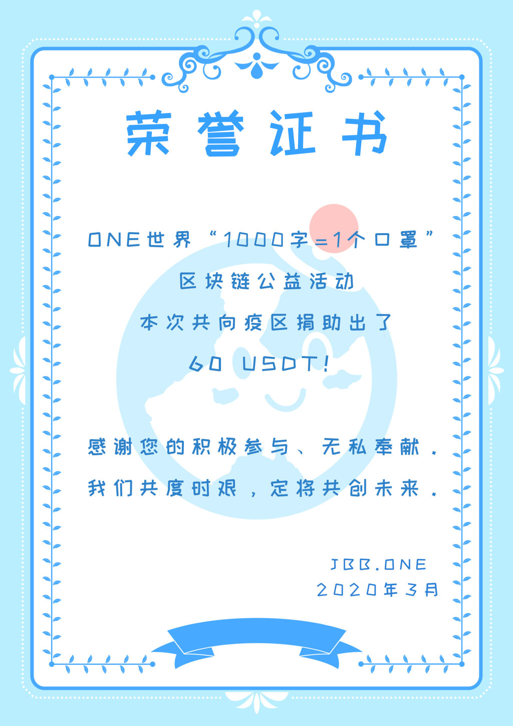 历时两个多月,ONE世界文字游戏平台发起的“1000字=1个口罩”区块链公益活动将于2020年04月06日(周一)正式结束!