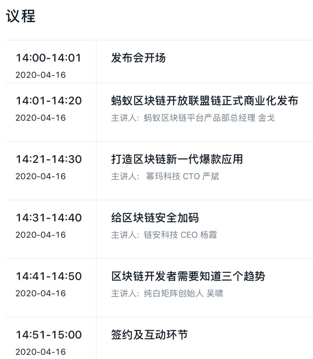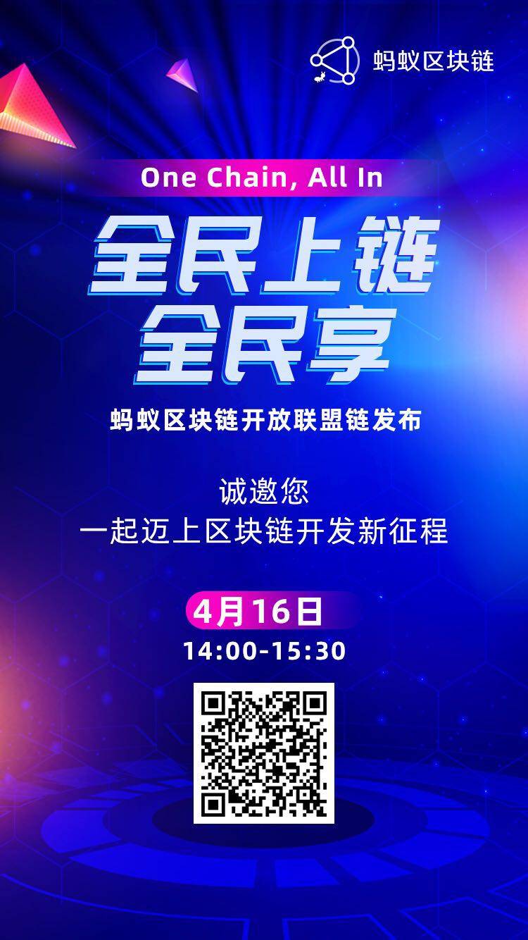 蚂蚁区块链将于4月16日举办「全民上链全民享」开放联盟链线上发布会。该发布会主要面向中小企业及区块链开发者,会上将发布最新福利,助力低门槛开发,轻松入链,并以多流量扶持以打造更可持续的商业化模式。
