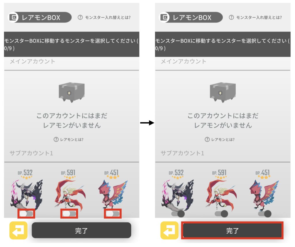 选择你想要放入MonsterBOX的怪兽。底下的图标从白变为黑色后表示移动成功。选择你想导入的怪兽后,点击“结束(完了)”。