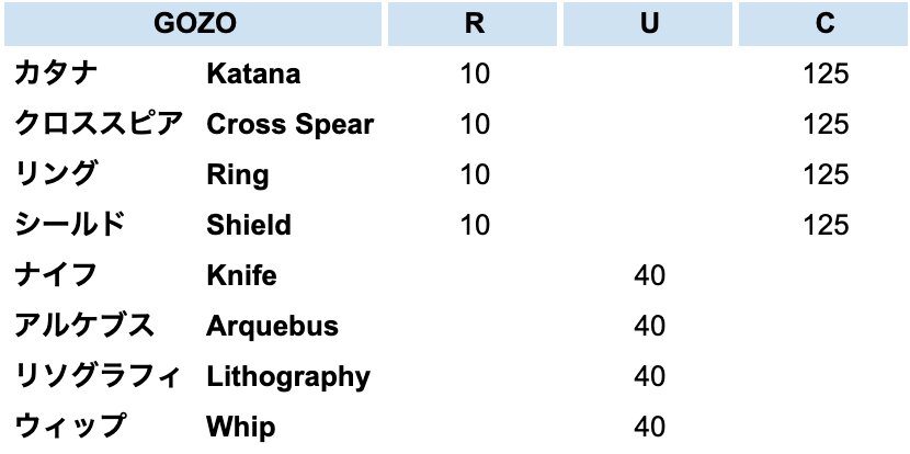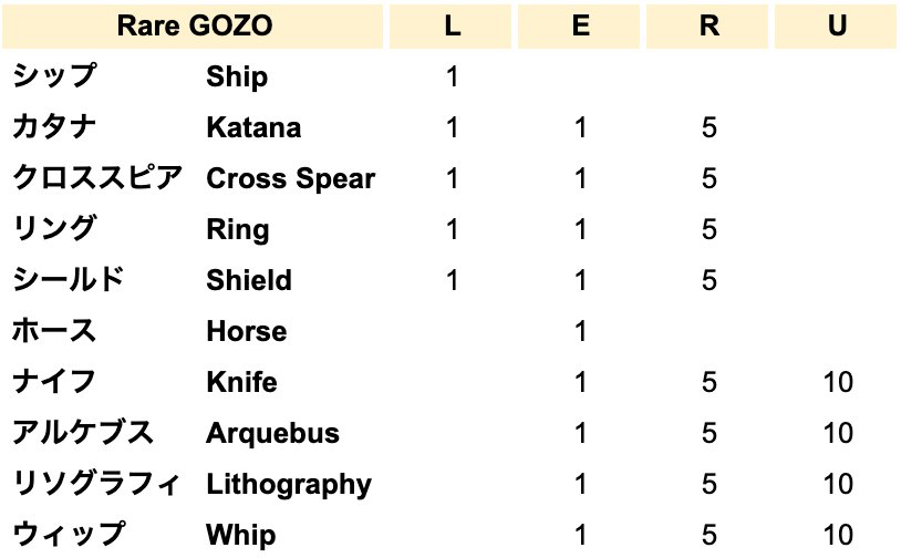 - 开启GOZO可以获得初始Extension。下面是GOZO中掉落的不同稀有度。(与用户的宝箱数无关,发送下列的所有数量。)