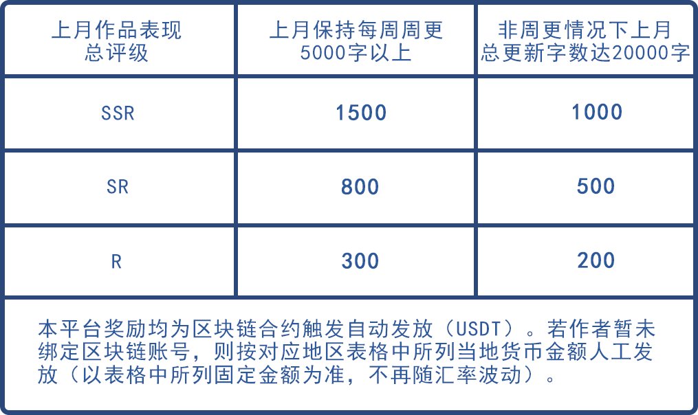 除去评级为N的作品,作者在上月保持每周周更5000字以上,或非周更情况下上月总更新字数达到20000字的,作者可根据上月作品表现总评级(一般来说,当有多个不同级作品时以更新字数更多的作品为准)获得以下相应数额的底薪收入: