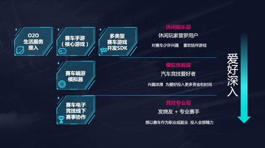 横向以赛车手游为体系拓展核心,以沙盘策略为基础玩法,一边开放SDK拓展更多玩法,一边利用游戏的沙盒特点自然接入更多O2O生活服务,实现社区的横向拓展,更多元化赛车游戏玩法的覆盖,还有多用途的生活服务的支持,扩大用户基数,拉长用户留存周期。