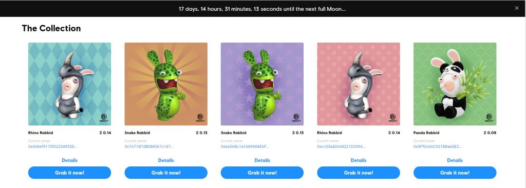目前兔子的售价从0.05ETH(10USD)到0.15ETH(30USD)不等。值得一提的是将在7月5日推出的满月售卖活动,所有参与Rabbids Token的玩家都将会获得一份神秘奖品。