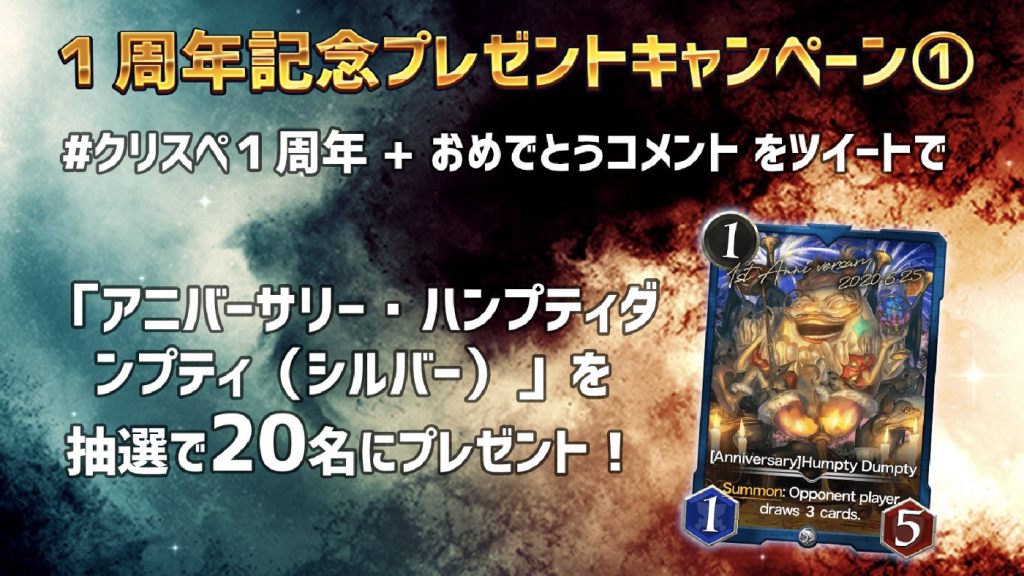 参加方法:发送附带#クリスペ1周年 标签+恭喜等评论的推文