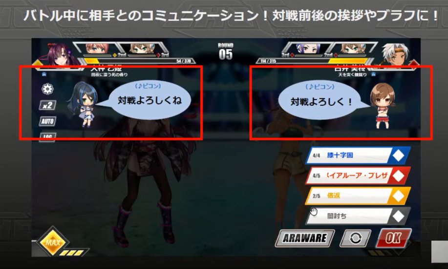 在对战中可以与对方交流的功能。直播中暂未公开详细,推测是对战时可以选择发送当前角色的带配音对话(参照一些卡牌游戏来看)。