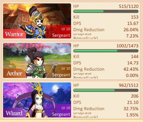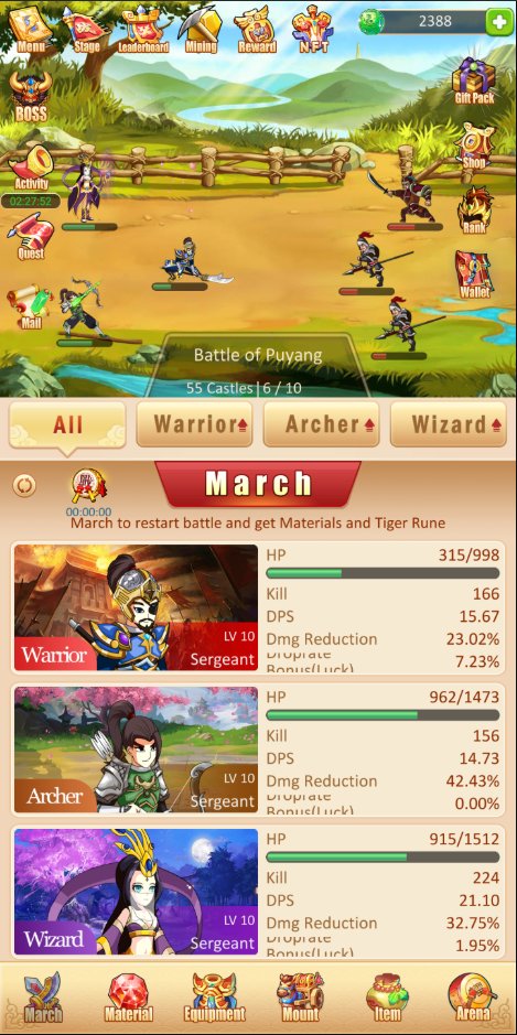游戏开始的时候你会获得一个战士角色,但如果你想认真玩这个游戏的话最终还是需要解散三个英雄。购买更多角色需要消耗少量的ETH,而升级角色需要消耗虎符。等级会增加一些据点强度,但从9级开始需要的虎符数量就很高了。