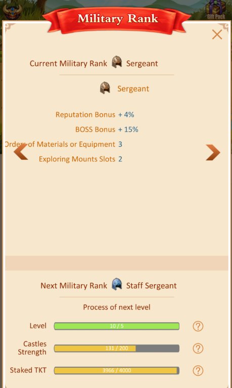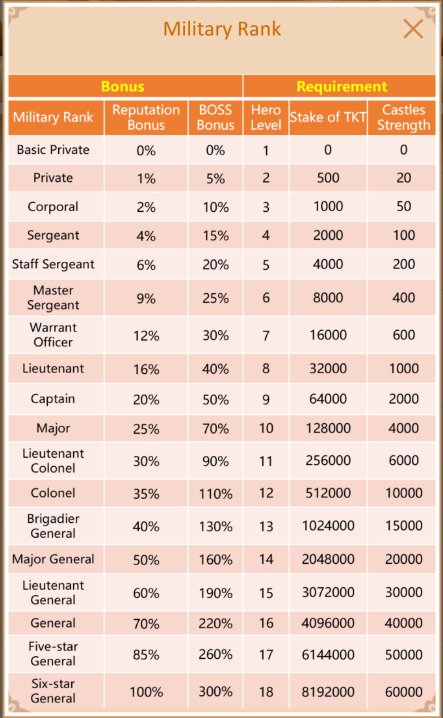 你可以在主界面查看军衔等级和提升所需。有一些活动没有等级要求,比如在线活动,任务,还有挖矿。提升军衔等级需要TKT,它的获取方法有:购买虎符,在交易市场购买其他玩家的道具,从其他玩家购买TKT,挖矿获得,在线活动,竞技场,boss战等等。