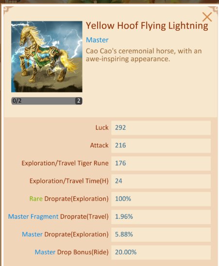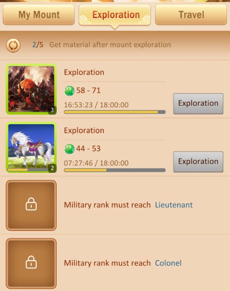 坐骑不仅能够装备,还可以寻找并收集虎符和材料。高级坐骑能带来更多的虎符和更稀有的材料。另外,升高军备等级可以解锁更多坐骑探索槽位。