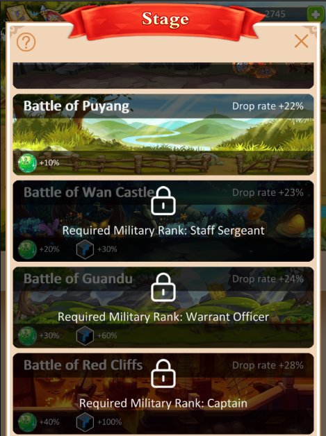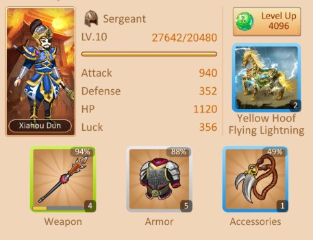装备是游戏进程中的很大一部分,但并不需要优先获取装备。你可以通过合成相同装备来让他们升级。每次升级都会消耗虎符并且消耗会越来越大。打造意见装备必须通过市场或者行军来获得相应材料。但是,打造出来的材料并不一定会是高品质。一些角色可以使用相同的装备,可以试着把同一件装备给不同的角色来用。幸运属性是比较重要的装备属性,可以则增加稀有物品的掉率。