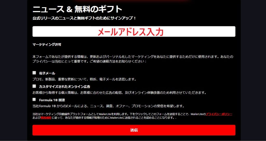 访问官方网站后有邮件地址输入栏,输入任意地址之后请点击下方的送信。