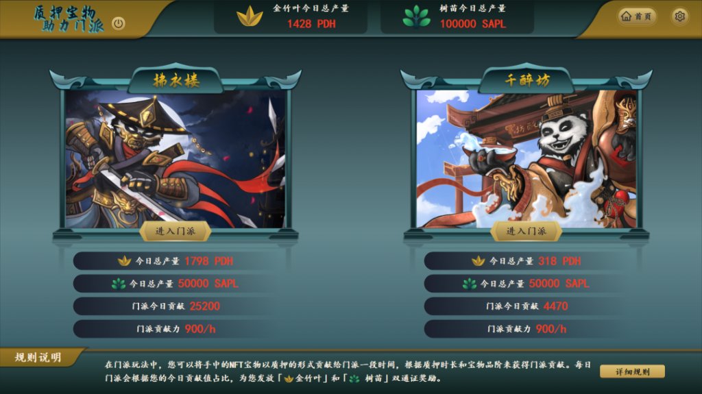 【金竹叶】和【树苗】将在“宝物质押”模式中每日产出,并根据各门派的总贡献值,分配到两大门派的奖池中。每位侠客都可在两大门派中随意分配自己的质押量。而奖池分配也将随侠客们的选择动态变化。