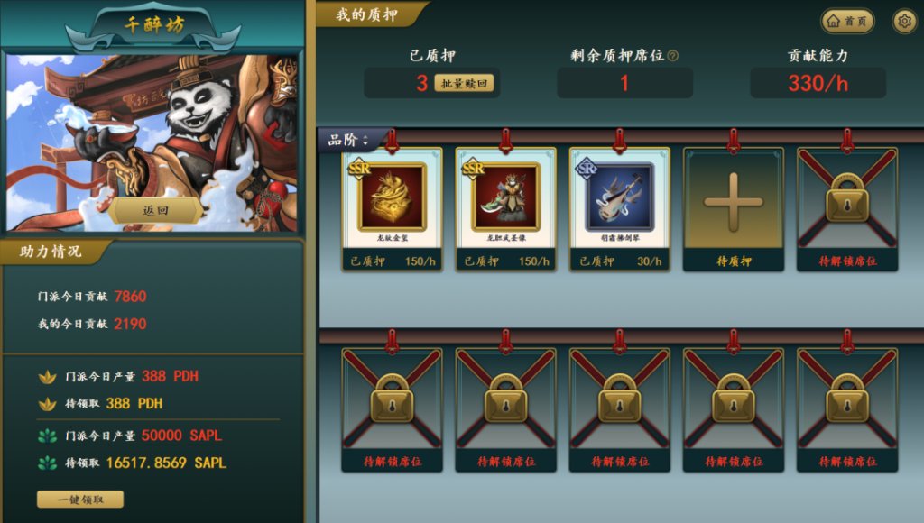 在门派质押页面中可以看到门派质押情况和当前门派贡献值。每个席位可以质押一个宝物,初始即拥有一个质押席位,并可以10000PDH/个的价格解锁99个额外席位。