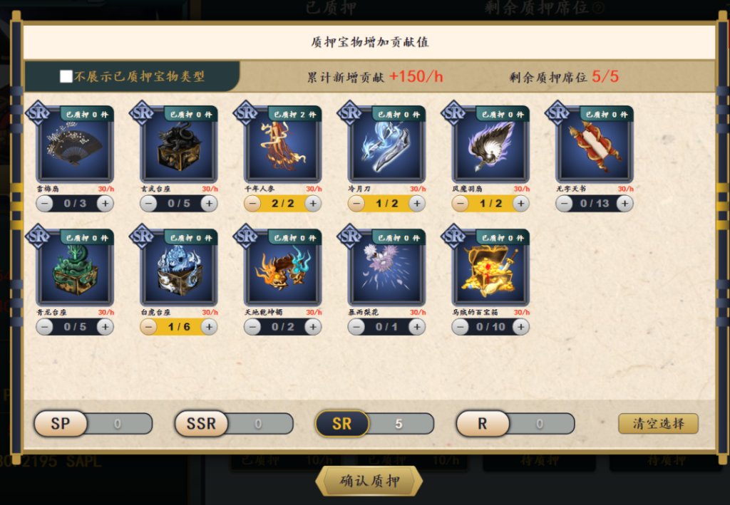 质押更多宝物,可以增加贡献能力。越高阶的宝物,增加的贡献能力越多。玩家的贡献值将根据贡献能力,随宝物质押时长进行累积(以小时为单位)。