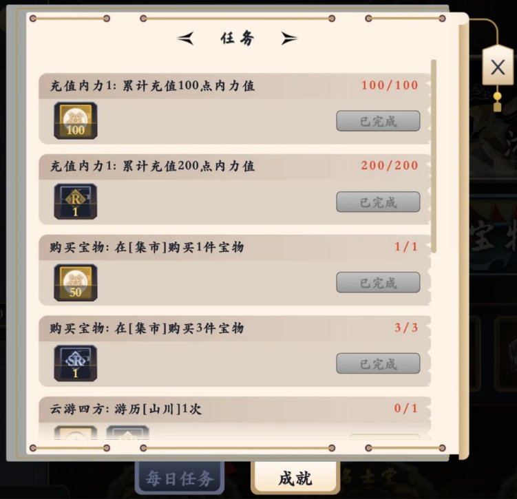 值得一提的是,在任务系统上线后,对于「游历山川」和「内力充值」两个系列的成就,玩家们的历史记录也会被纳入成就进度中~