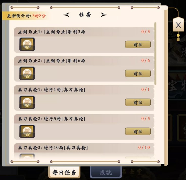“每日任务”是熊猫侠客们的日常修行,该类任务会每日刷新。您可以每天在不需消耗内力的【点到为止】模式中赢得胜利,获得最多250点免费内力值!同时,日常的切磋、讨伐、游历等也可获得内力奖励哦!
