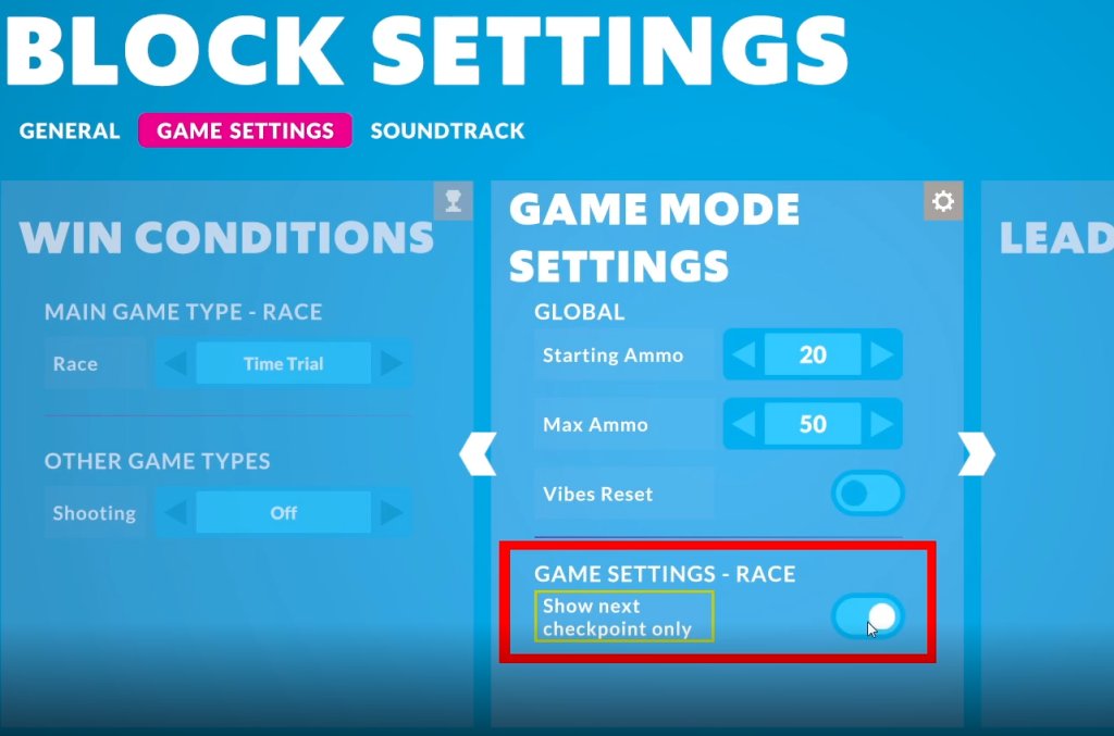 对于构建者,可以选择立即切换“显示下一个检查点”。这将帮助控制要提供给Block Party玩家的信息。所有检查点或仅下一个检查点。