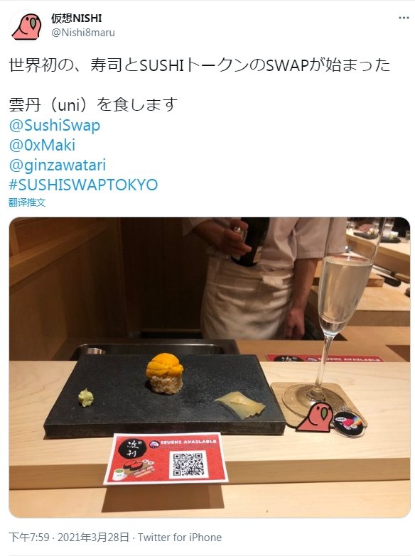 昨日,日本网友仮想NISHI(@Nishi8maru)分享了自己在寿司店【渡利】中,使用寿司币购买了一个真正的寿司。