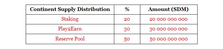For each new Continent a fixed amount of 100 000 000 000 (100 BLN) SDMs will be provided with a following distribution: