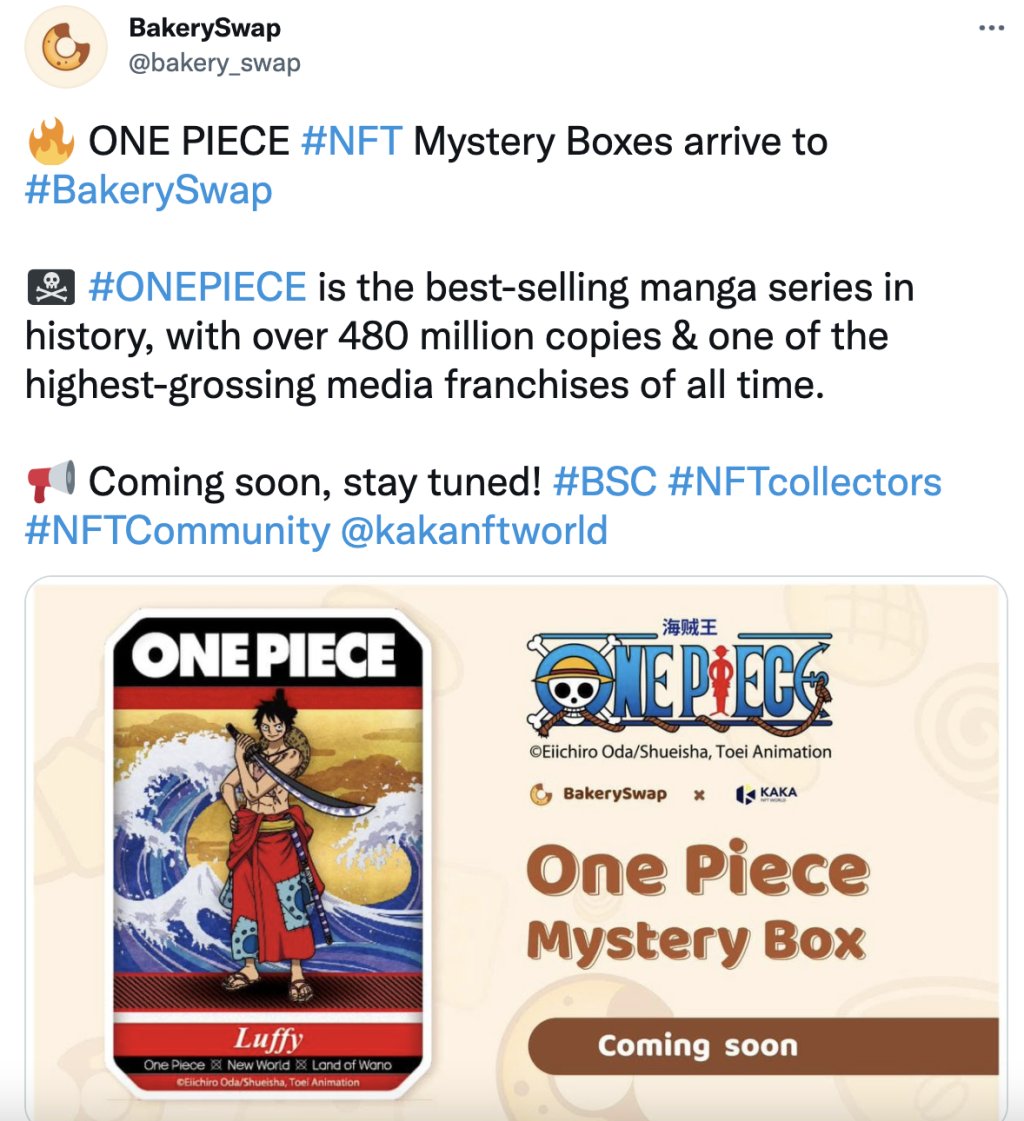 建立在币安智能链上的去中心化交易所 BakerySwap 近日在推特宣布,将与KAKA合作,并上线超人气日本漫画《海贼王》系列NFT盲盒!