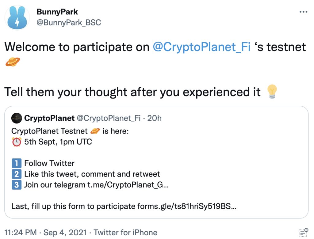 8月份,BunnyPark公布了SaaS孵化器计划,同时提供1000万美元孵化基金,以用于支持BSC上优秀的NFT和GameFI项目。CryptoPlanet 便是来自该孵化器的首批2个元宇宙游戏之一。