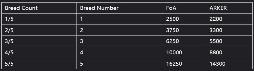 为了繁殖宠物,用户必须用FoA和ARKER付款,这是阿克尔生态系统的两个代币。