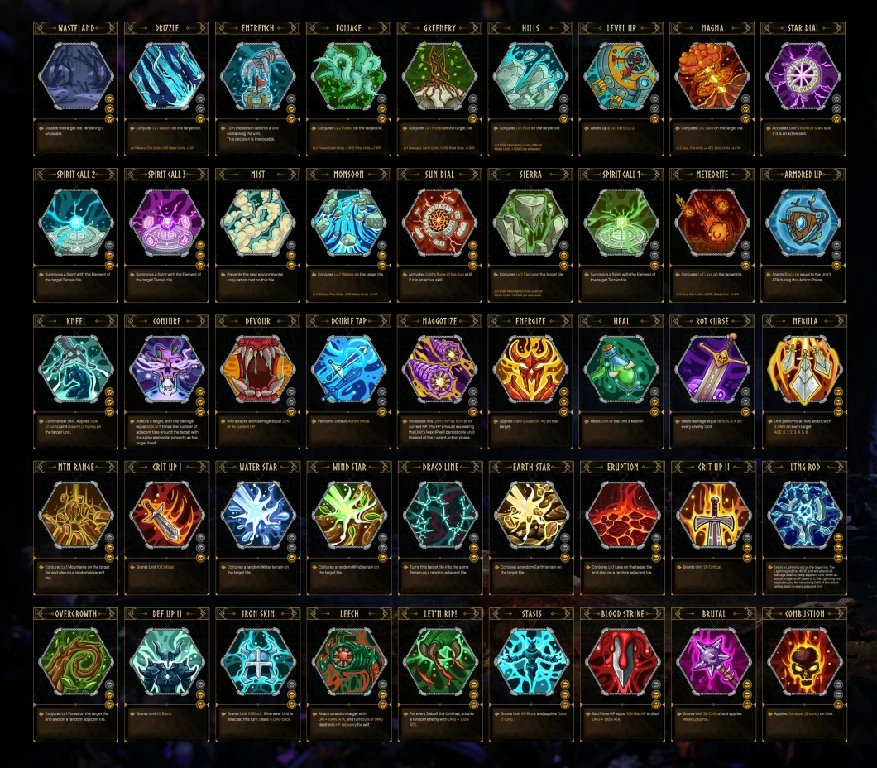 每个符文由两个创造(右)和吸收(左)类型的符文碎片组成。游戏的第一个版本将采用100种不同的创造符文与其他100种吸收符文相结合,形成多达10000种具有独特效果的符文。符文分别针对角色和战场地形;