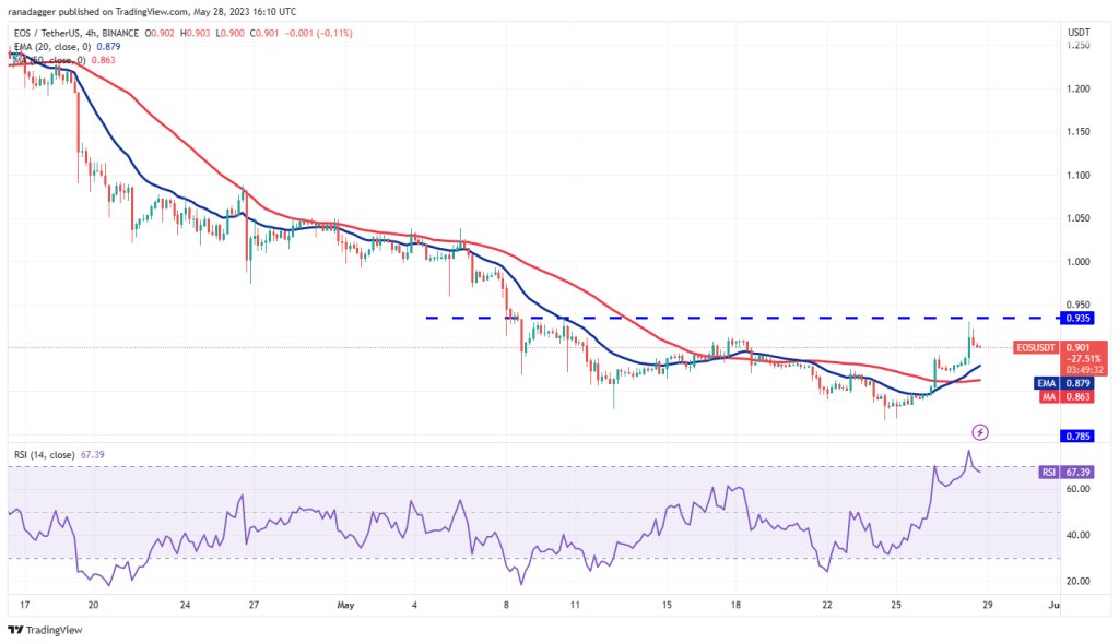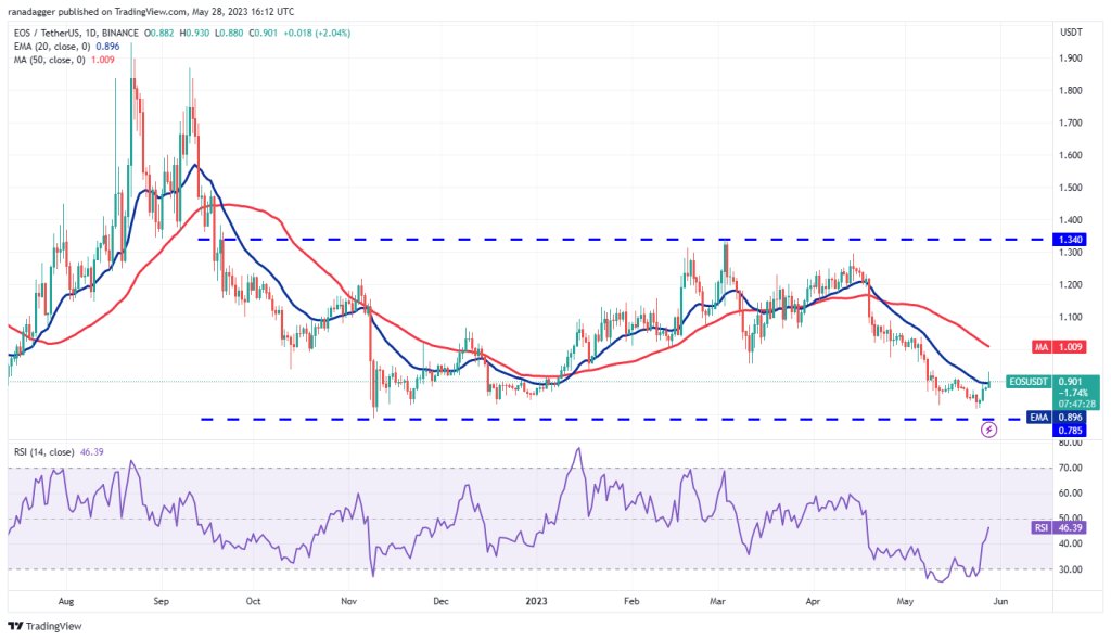 5月25日,EOS/USDT对从0.81美元反弹,并在5月28日上升至20天EMA(0.89美元)以上。这是第一个迹象表明范围仍然完整。牛市将试图将价格推高至50天SMA(1美元),熊市可能会在那里发起强有力的防守。