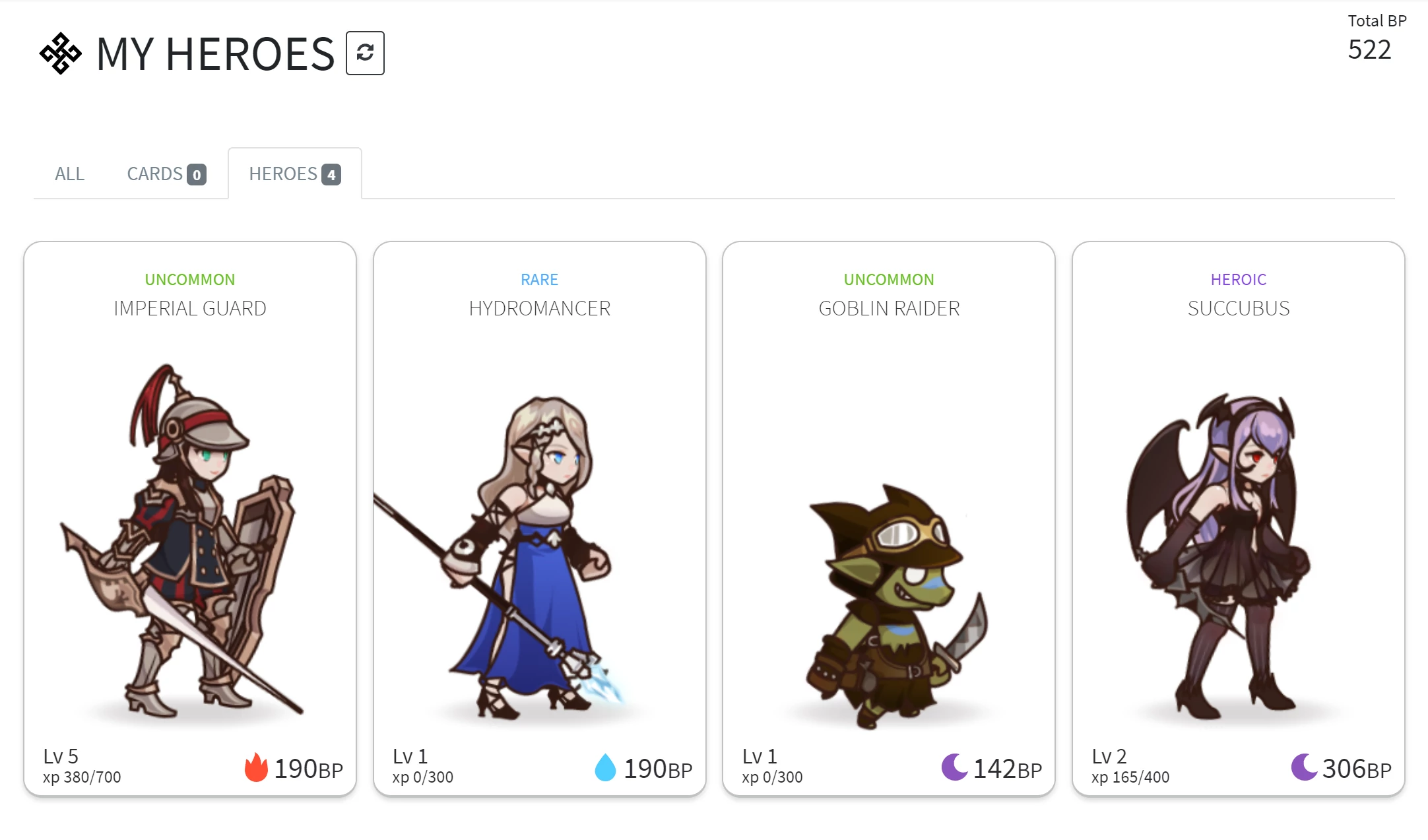 英雄是有等级的,在ガチャ(扭蛋)中有UNCOMMON(罕见),RARE(珍贵),HEROIC(史诗),LEGENDARY(传奇)这些类型。越稀有价格越贵。