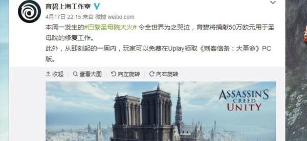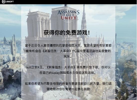 4月17日,因近期不幸发生的巴黎圣母院失火一事,育碧官方宣布了《刺客信条:大革命》免费的消息——直到4月25日,玩家可以免费在Uplay领取该游戏。