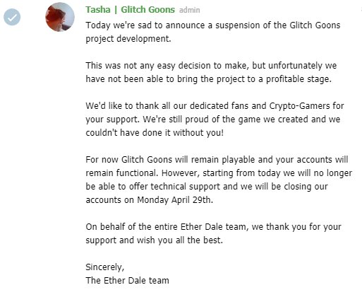 Ether Dale于22日宣布将不再支持《Glitch Goons》的开发,并将在4月29日关闭账户。