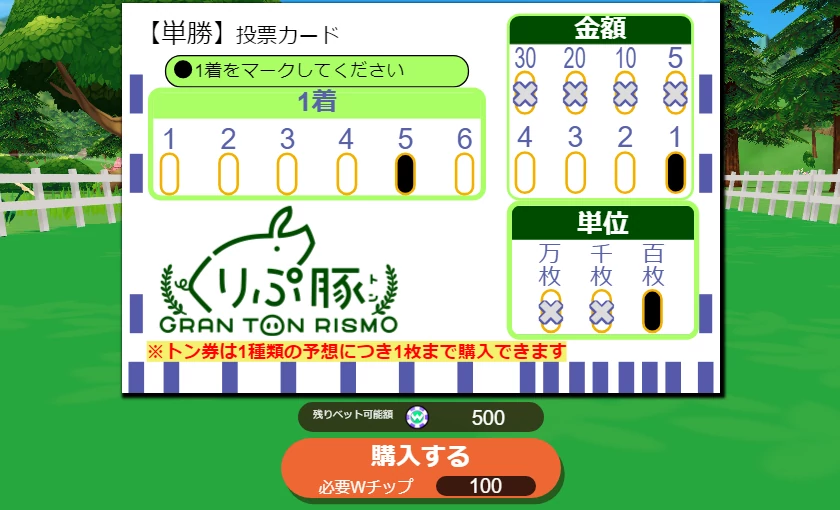选好要下注的猪之后,请点击右边的“购买猪券(トン券購入)”