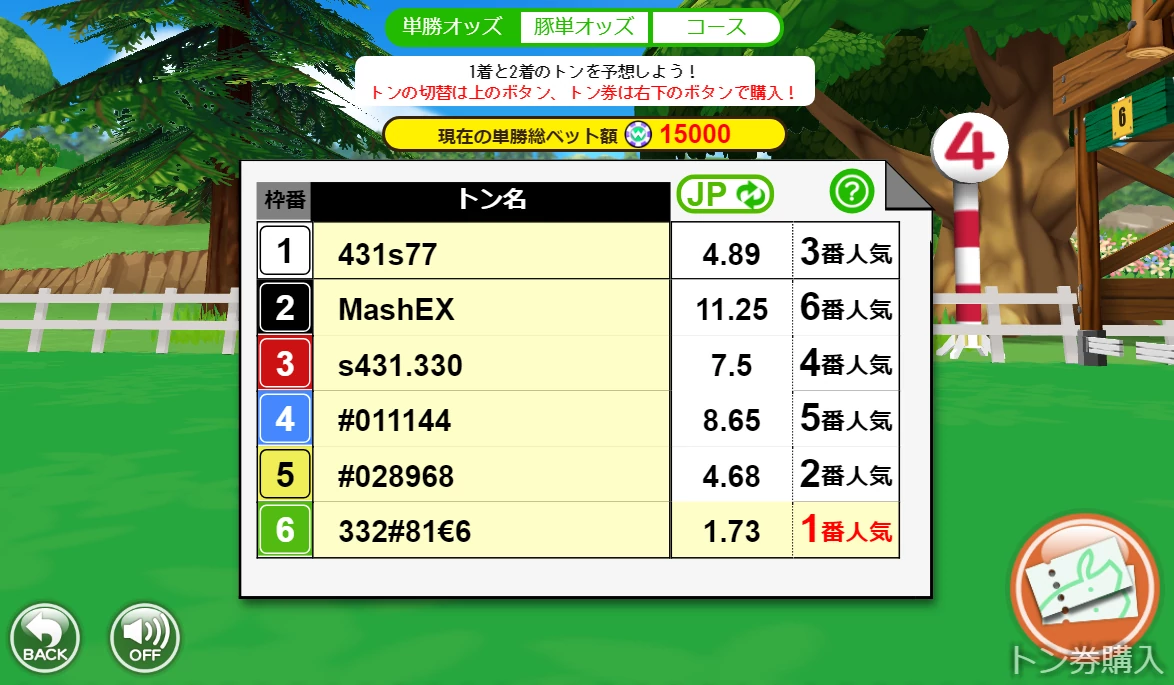 通过选择下注竞赛,可以确认其竞赛中上场的猪的预先信息和现在的赔率。