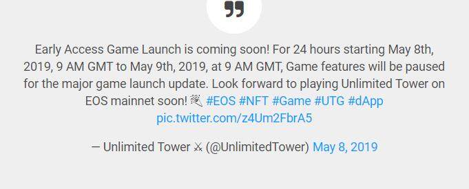 “早期访问游戏即将推出!从5月8日上午9点(GTM)到2019年5月9日上午9点(GTM)的24小时期间,将暂停游戏功能以便进行主要游戏发布的更新。期待很快就能在EOS主网上玩到《Unlimited Tower》啦!”