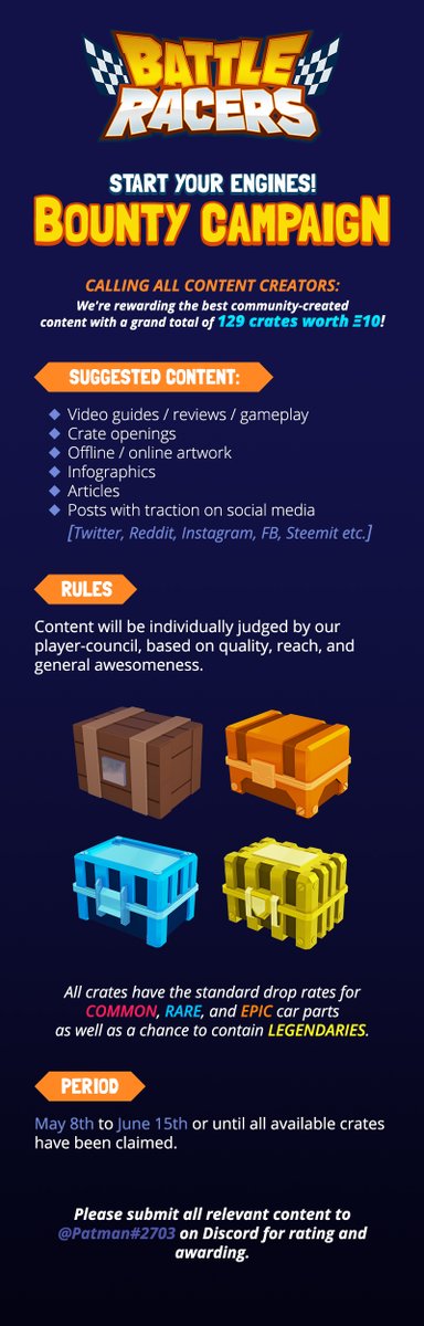 「クローズドベータ版は既にオンラインし、すべてのコンテンツ作成者は注目!私たちはクリエイティブな<Battle Racers>コンテンツには、総価値合計10 ETHの宝箱をプレゼントします。」