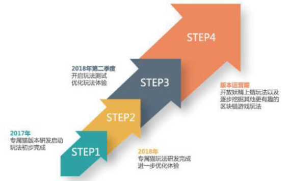 《一起来捉妖》项目于2017年开启了区块链专属猫玩法的研发,并在2017年内初步完成了相关玩法。在2018年的一季度,专属猫相关玩法的研发完成,进入体验优化阶段。2018年二季度开启的测试中,将对专属猫相关玩法进行测试,并进一步优化玩法体验。以专属猫玩法的设计、研发与运营为基础,在未来的版本运营期内,《一起来捉妖》还将上线稀有妖精上链玩法,并逐步挖掘其他更多有趣的区块链游戏化玩法。