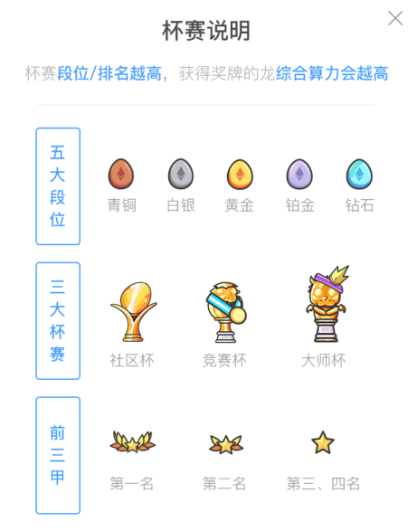 - 称号:龙的荣誉。每条参赛的小龙都可能会获得称号,未来会拓展出更多的玩法,如在龙堡中,拥有杯赛奖牌的斗龙挖矿能力会有不同程度的提升。