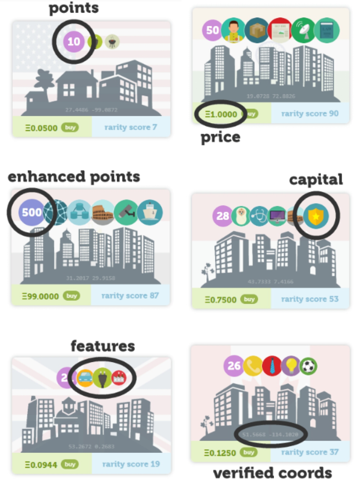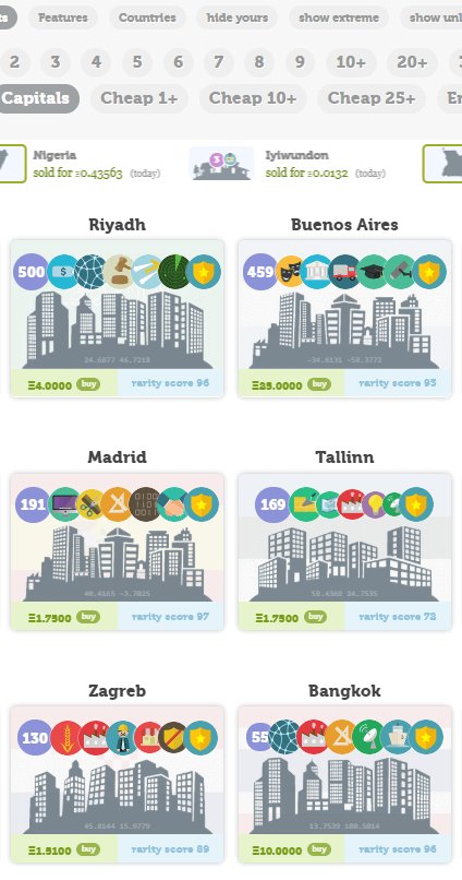 可供出售的位置的价格将显示在ETH中,价格可以由该位置的所有者任意修改。购买位置的玩家需要在MetaMask中提交付款,并将于几分钟内收到该位置。每个位置都会使用国家官方人口普查数据和谷歌地图进行验证,并记录在区块链中。