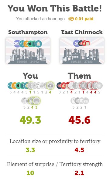 发动战役是从其他玩家手中夺取领土的方式,玩家可以通过将鼠标悬停在其上并单击蓝色斧头图标来攻击其中一个红色方块,且每天可以进行的攻击数量没有限制。战斗是通过绘制得分轮次的随机过程进行的,最终得分最高的人将赢得比赛。而进入战斗的起始得分越高,玩家的赔率就越高。