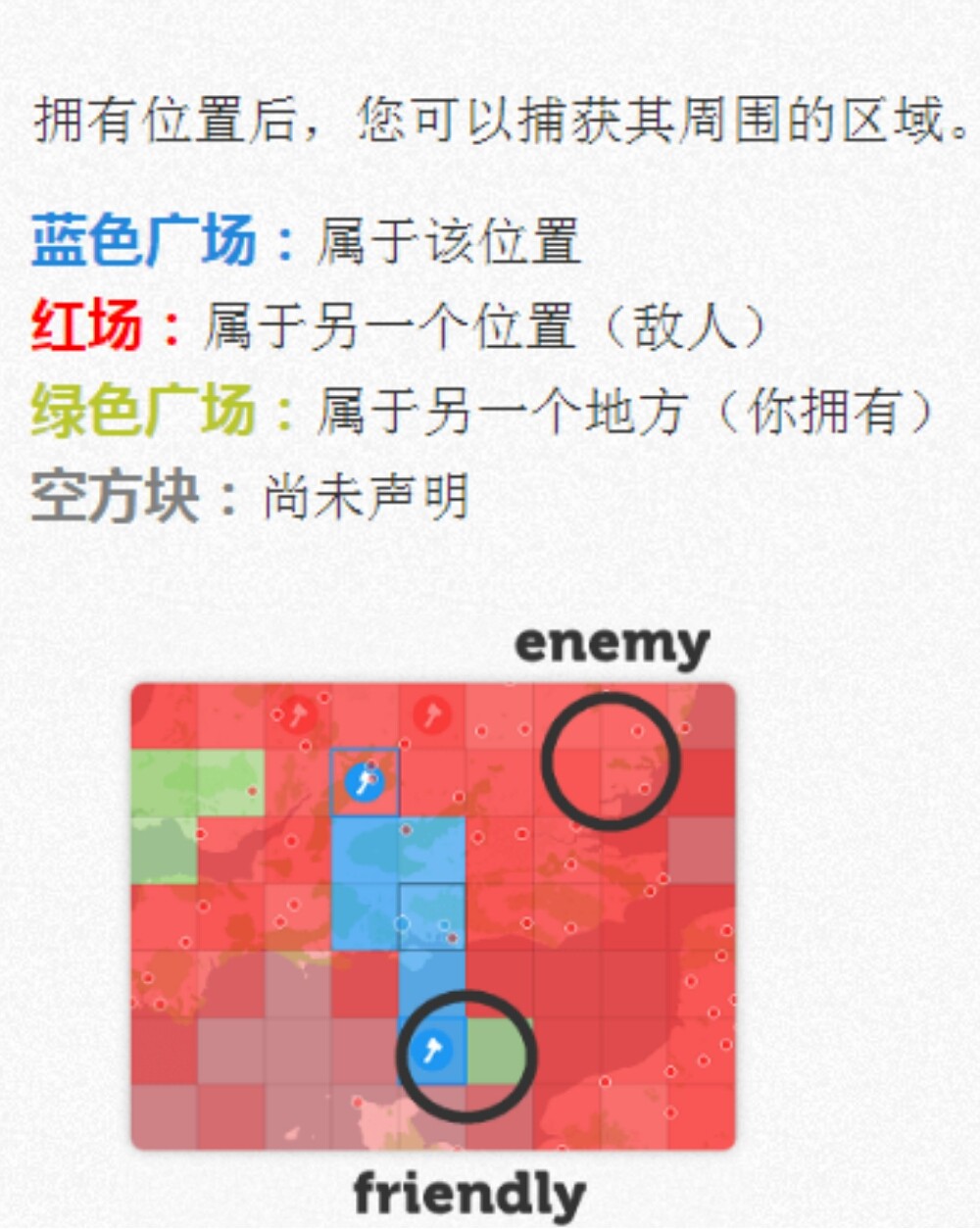 玩家可以通过占领无人的城市和对其他玩家发动战争来获取领土和领土上的资源,并通过资源的交易获取利润,再购买其他玩家出售的城市和国家来扩大地盘。游戏中为自己的领土提供防御并避免其他玩家的攻击和占领需要进行消费,这种机制提供了良性的资金循环,防止玩家出现只累积和出售资源而不消费的行为。