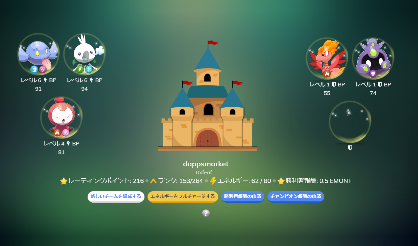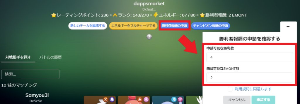 如上图一样,点击‘勝利者報酬の申請’以后,分别确认“已获胜次数”,“可领取的EMONT”量,再点击‘申請する’,即可完成领取。