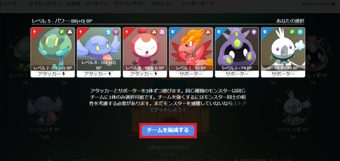 在战斗画面内点击‘新しいチームを編成する’按钮,进入队伍的编辑界面。分别选择攻击手,辅助者后,再点击‘チームを編成する’,即可完成组队。